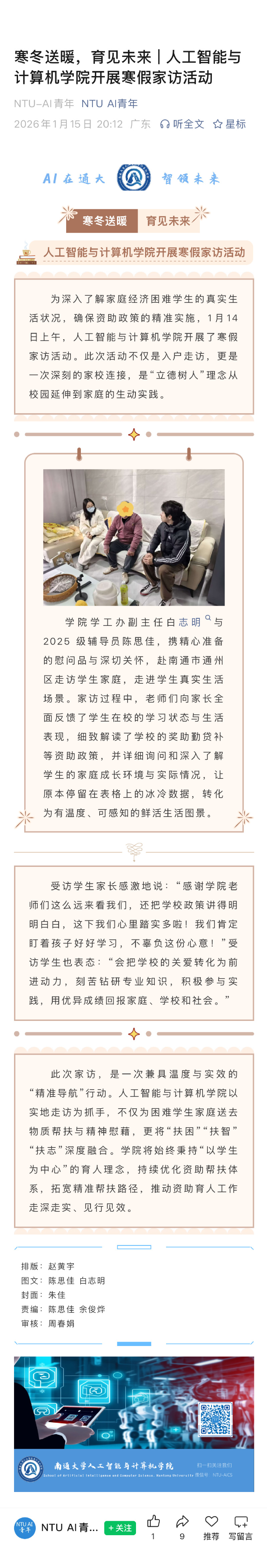 寒冬送暖,育见未来 人工智能与计算机学院开展寒假家访活动