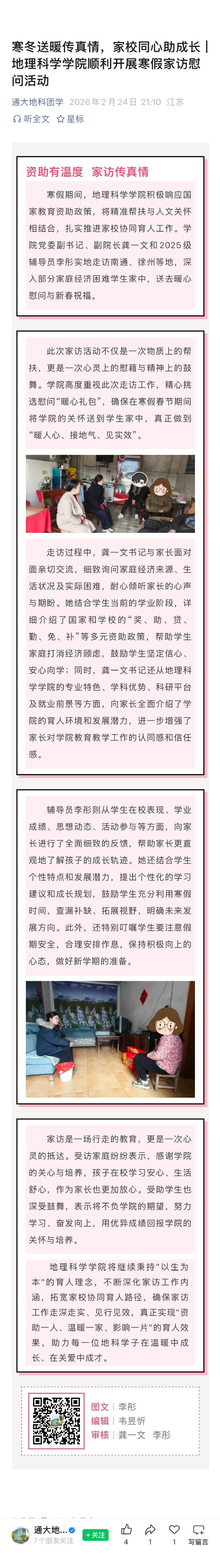 寒冬送暖传真情,家校同心助成长 地理科学学院顺利开展寒假家访慰问活动