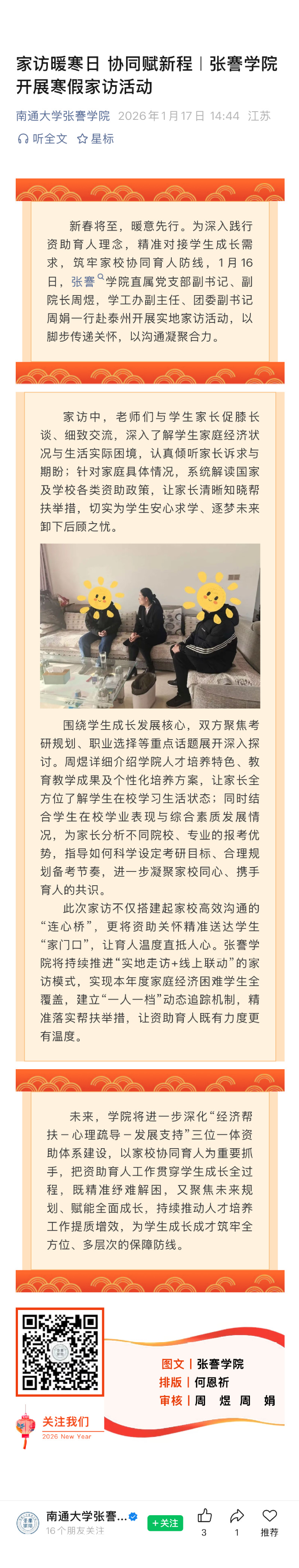 家访暖寒日 协同赋新程|张謇学院开展寒假家访活动